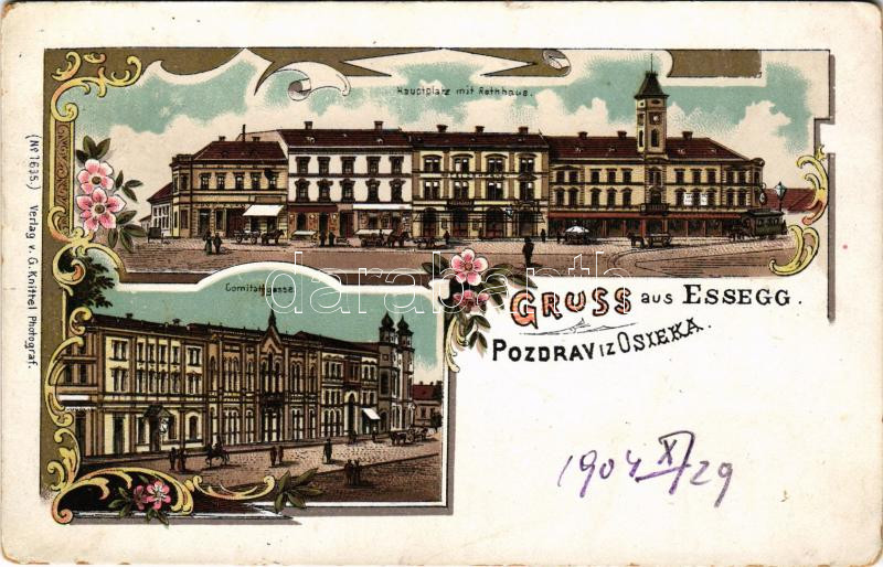 Leírás: Eszék, Essegg, Osijek; Hauptplatz mit Rathaus, Comitatgasse / main square, town hall. G. Knittel Art Nouveau, floral, litho (EK)
