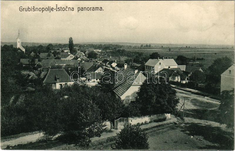 Grobosinc, Grubisnopolje, Grubisno Polje; Istocna panorama / látkép, szerb ortodox templom. Fotogr. N. Toth / general view with Serbian Orthodox church (ragasztónyom / glue marks)