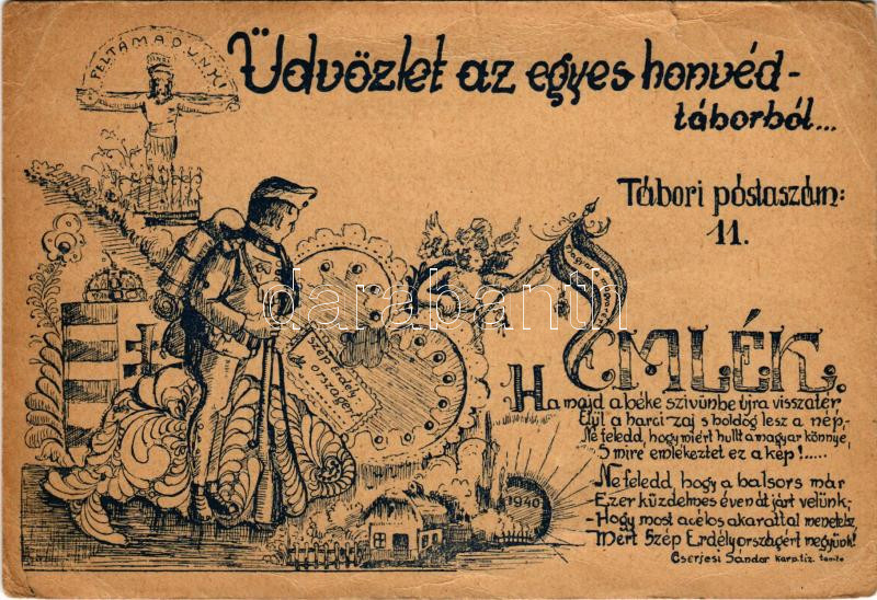 Leírás: 1940 Üdvözlet az egyes honvédtáborból... Tábori postaszám 11., Szép Erdélyországért! Feltámadunk irredenta emlék s: Cserjesi Sándor karp. tiz. tanító (szakadások / tears)