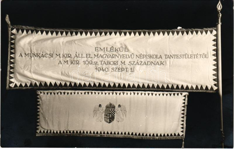 1940. szept. 1. - Emlék zászló a Munkácsi M. kir. áll. el. magyar nyelvű népiskola tantestületétől a M. kir. 109. sz. tábori m. századnak. Locker Műterem Munkács, photo (fl)