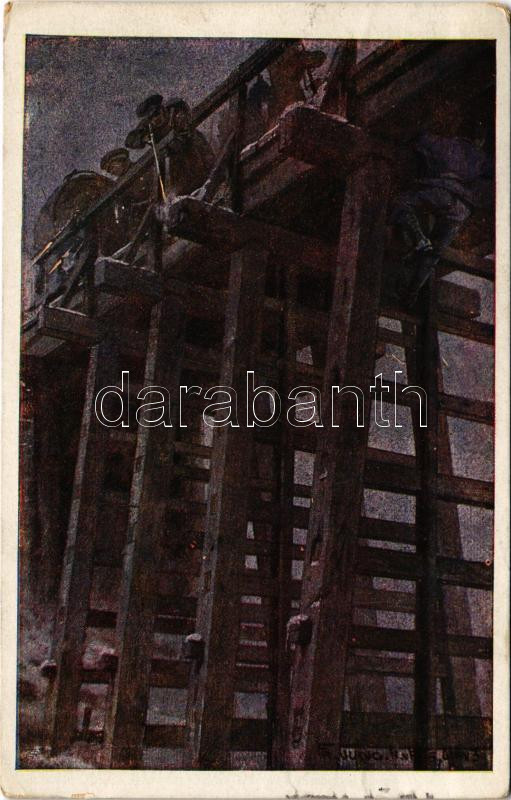 Leutnant Emil Pregragovic des Pionierbataillons Nr. 7. befestigt von den Russen heftig beschossen, die Sprengladung an dem Fachwerke der Bialabrücke, deren Vernichtung er später durch Brandlegung vollendete. Rotes Kreuz Kriegshilfsbüro Nr. 579. Aus dem goldenen Buche der Armee Serie VI. / WWI Austro-Hungarian K.u.K. military art postcard, support fund s: Fr. Jung (EK)