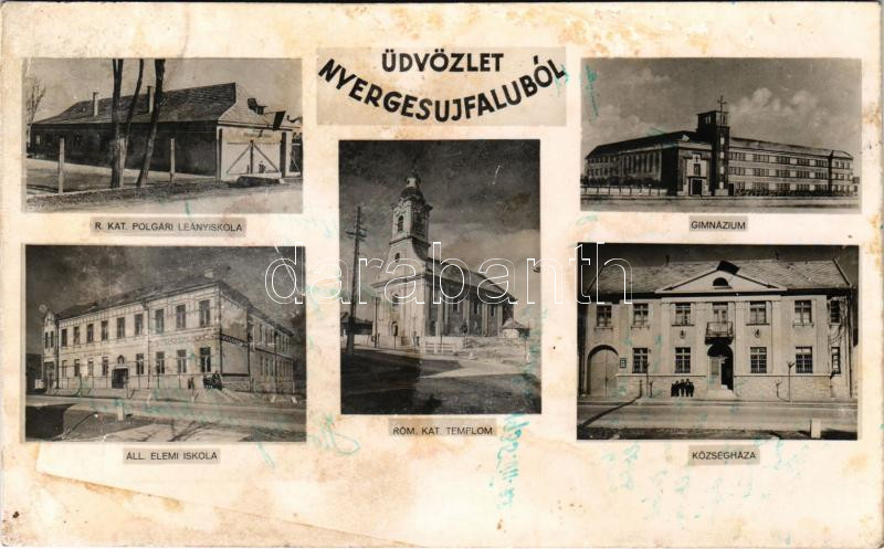 Leírás: 1942 Nyergesújfalu, Római katolikus polgári leányiskola, Állami elemi iskola, Római katolikus templom, gimnázium, községháza (fl)