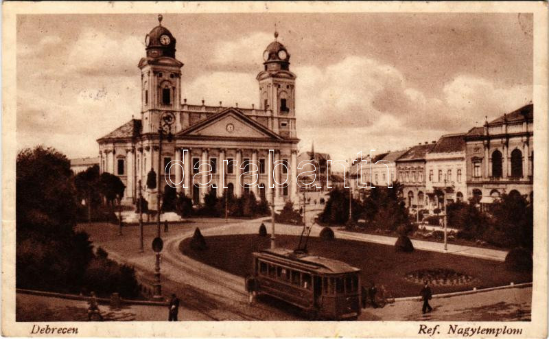 Debrecen, Református nagytemplom, villamos https://www.darabanth.com/hu/477-Gyorsarveres/477.0/Kepeslapok/Magyarorszag~1500005/Debrecen-Reformatus-nagytemplom-villamos~II3244696