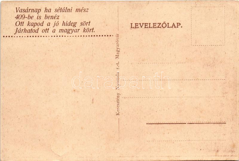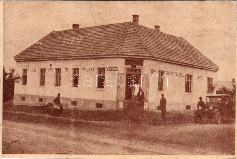 Leírás: Magyaróvár, Mosonmagyaróvár; 409-es csárda, vendéglő, étterem, bor, sör és pálinka mérés, kocsma, automobil, oldalkocsis motorkerékpár