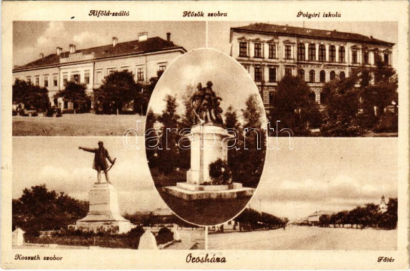 Orosháza, Kossuth szobor, Alföld szálló, Hősök szobra, Polgári iskola,... https://www.darabanth.com/hu/477-Gyorsarveres/477.0/Kepeslapok/Magyarorszag~1500005/Oroshaza-Kossuth-szobor-Alfold-szallo-Hosok-szobra-Polgari-iskola-Fo-ter~II3249286