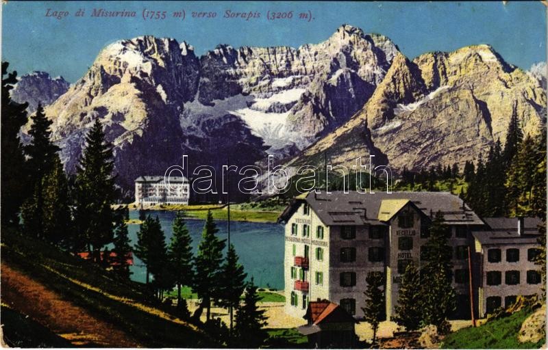 Leírás: Lago di Misurina, verso Sorapis / hotel, mountain, lake (kis szakadás / small tear)