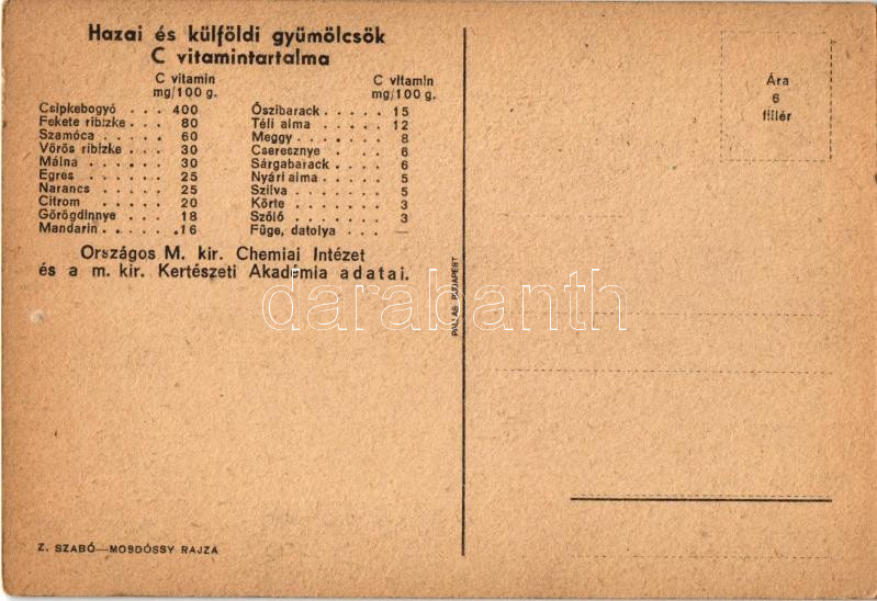 Nyár a télben a gyümölcs! Magyar egészségügyi propaganda, C-vitamin táblázat a hátoldalon. Országos M. kir. Chemiai Intézet és M. kir. Kertészeti Akadémia adatai / Hungarian health campaign propaganda, Vitamin C chart s: Z. Szabó-Mosdóssy