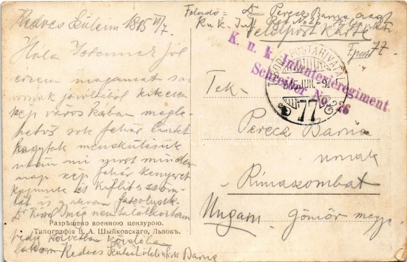 Leírás: 1915 Sambir, Szambir, Sambor; Ul. Kopernika / street + "K.u.K. Infanterieregiment Schreiber No. 26." "TÁBORI POSTAHIVATAL 77" (EK)