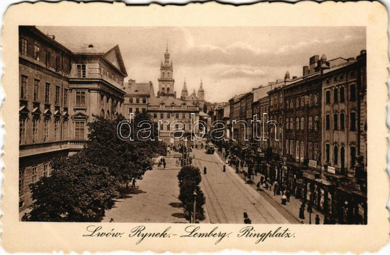 Leírás: Lviv, Lwów, Lemberg; Rynek / Ringplatz / square, tram, shops