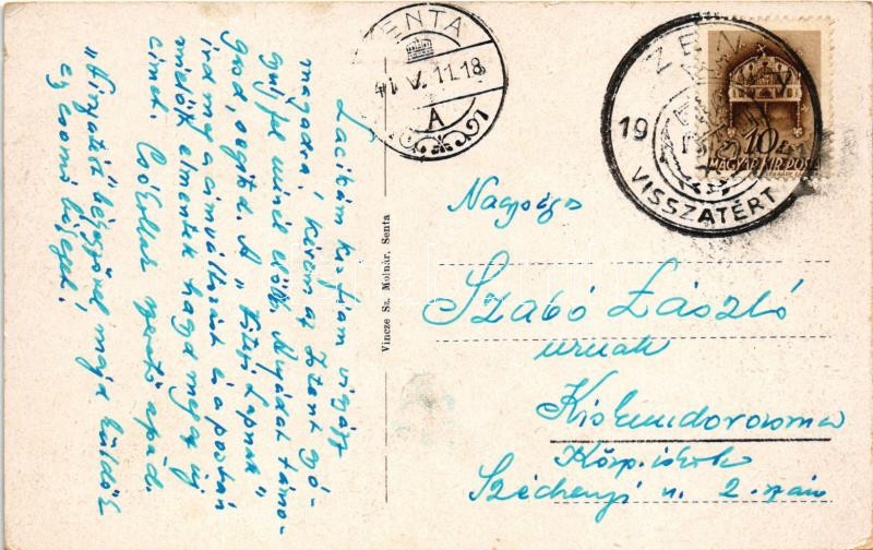 Leírás: 1941 Zenta, Senta; Sándor király utca, kerékpár, Leo Bergel üzlete. Vincze Sz. Molnár kiadása / street view, bicycle, shops + "1941 Zenta visszatért" So. Stpl. (EK)