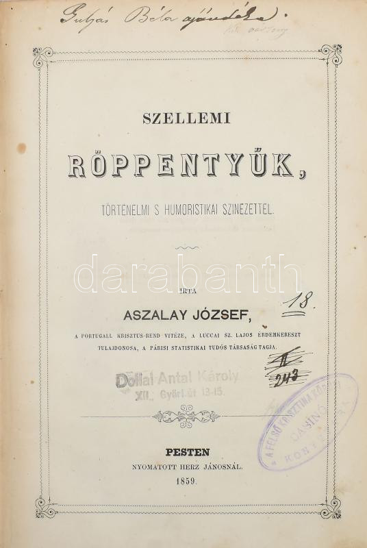 Aszalay József: Szellemi röppentyűk, történelmi s humoristikai szinezettel. Pest, 1859, Herz János, 2+419+3 p. Korabeli átkötött félvászon-kötés, kopott borítóval, sérült gerinccel, a címlapon bejegyzésekkel és bélyegzéssel.