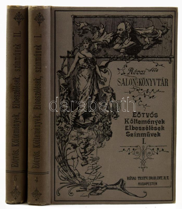 Leírás: B. Eötvös József: Költemények, elbeszélések, színművek I-II. köt. Révai-féle Salon-Könyvtár. Bp., 1894, Ráth Mór, (Hornyánszky-ny.), 4+294+2 p.; 2+315+1 p. 4. kiad. Kiadói festett, illusztrált egészvászon-kötés, Gottermayer-kötés, jó állapotban.
