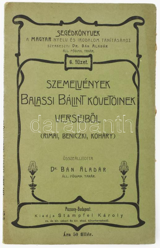 Bán Aladár: Szemelvények Balassi Bálint követőinek verseiből. (Rimai, Beniczki, Koháry.) Összeáll.: Dr. - -. Segédkönyvek a Magyar Nyelv és Irodalom Tanításához 6. füzet. Pozsony-Bp., 1903,Stampfel Károly, 46+1 p. Kiadói papírkötés, felvágatlan példány.