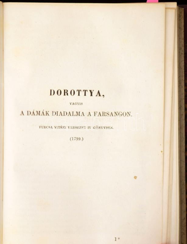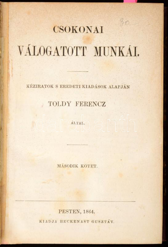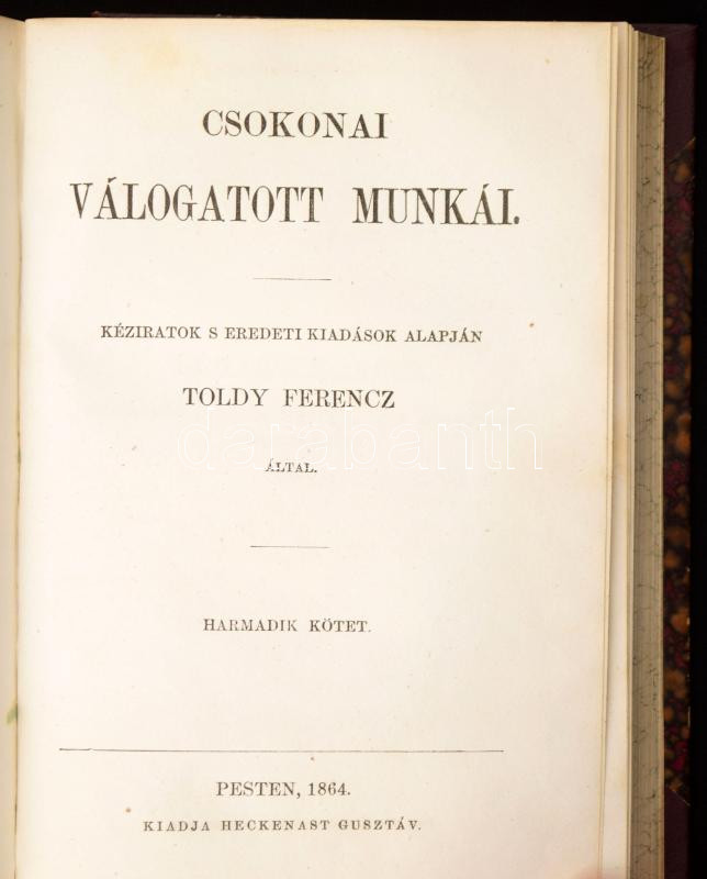 Csokonai válogatott munkái II-III. köt. [Egykötetben.] Kéziratok s eredeti kiadások alapján Toldy Ferencz által. Pest, 1864, Heckenast Gusztáv, (Landerer és Heckenast-ny.),207+155+1+184 p. Átkötött félvászon-kötés, kissé kopott borítóval.