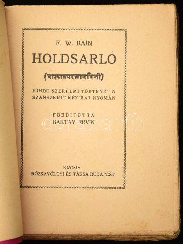 F. W. Bain: Holdsarló. Hindu szerelmi történet a szanszkrit kézirat nyomán. Ford.: Baktay Ervin. Bp.,[1918.], Rózsavölgyi,(Korvin-ny.), 243+1 p. Első kiadás. Kiadói papírkötés. Megjelent 3000 példányban.