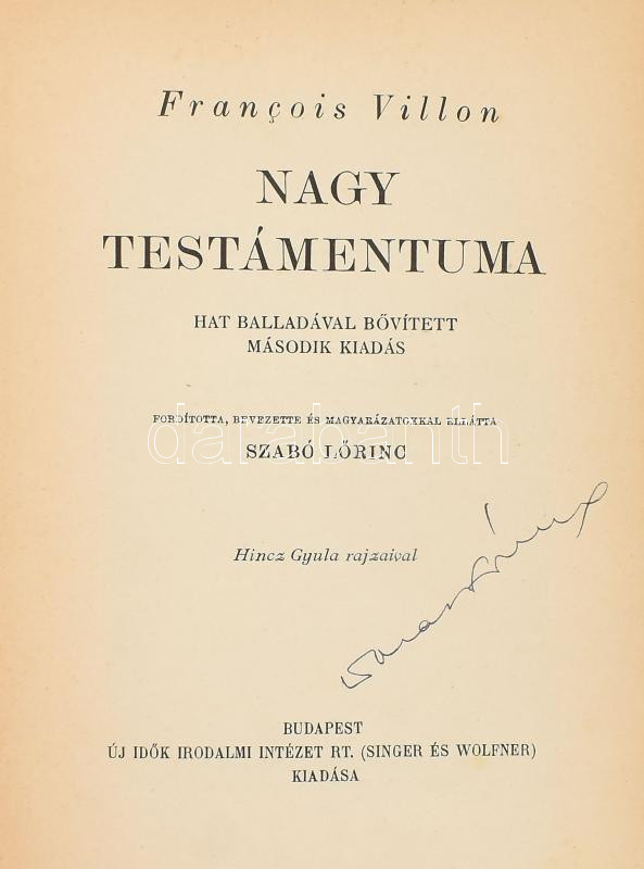 Francois Villon: Nagy testámentuma. Hat balladával bővített második kiadás. Ford., bev. és magyarázatokkal ellátta: Szabó Lőrinc. Hincz Gyula rajzaival. Bp.,1944,Új Idők. Kiadói félvászon-kötésben, kopott borítóval, laza fűzéssel, hiányzó elülső szennylappal.