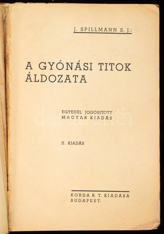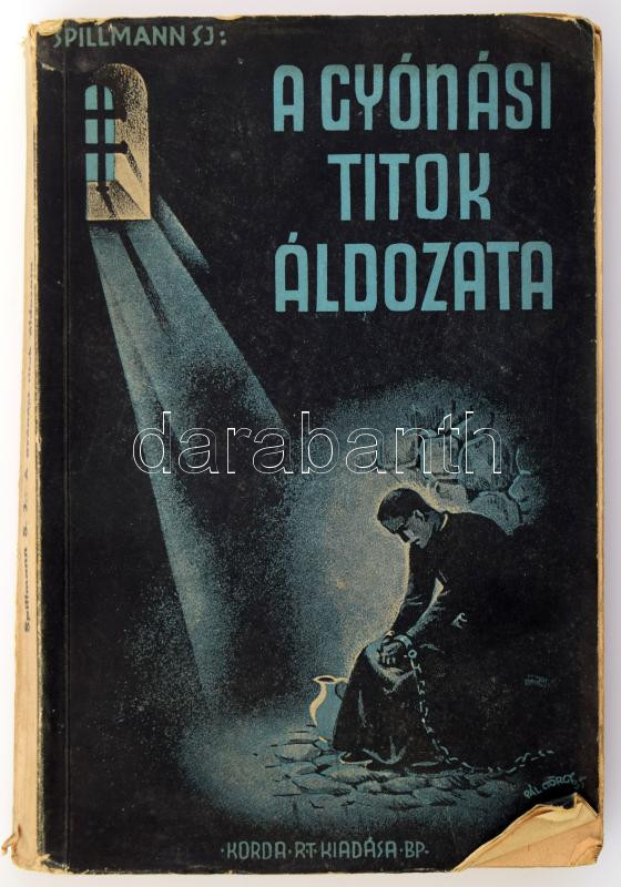 J. Spillmann: A gyónási titok áldozata. Bp.,(1942.) ,Korda Rt. 2. kiadás. A borító Pál György munkája. Kiadói papírkötés, sérült borítóval és kötéssel, a borító részben elvált a könytesttől.