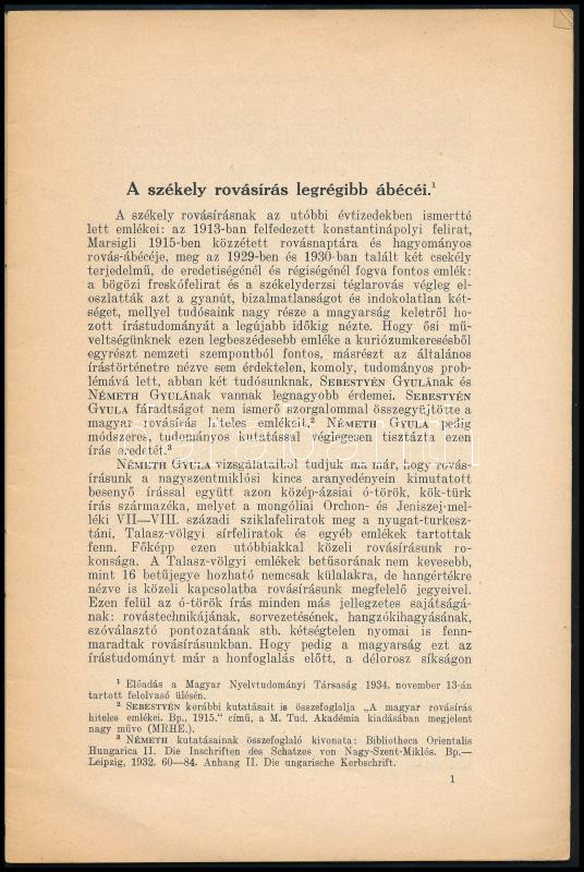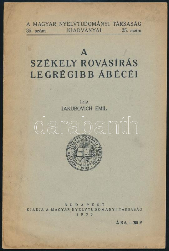Jakubovich Emil: A székely rovásírás legrégibb ábécéi. A Magyar Nyelvtudományi Társaság kiadványai 35. sz. Bp., 1935, Magyar Nyelvtudományi Társaság, 16 p.+ IV t. Kiadói tűzött papírkötés, kissé foltos borítóval, egyébként jó állapotban.