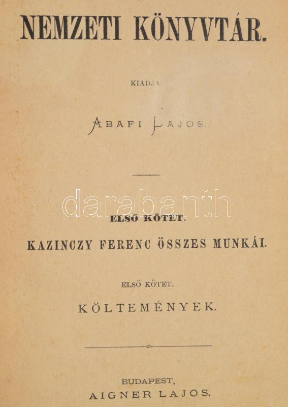 Kazinczy Ferenc összes munkái I-IV. köt. I-II. köt.: Költemények. I-II. köt. III. köt.: Pályám emlékezete. IV. köt.: Erdélyi levelek. Kiadja: Abafi Lajos. Nemzeti Könyvtár. I, VII., III., XII. köt. Bp., én.-1879, Aigner Lajos, (Wilckens F. C. és Fia - Markovits és Garai - ny.), 2+V+1+289+1+VI p.; XII+IV+307 p.;4+XVI+371 p.;XXVI+388 p. Kiadó egészvászon-kötés, kopott borítóval.