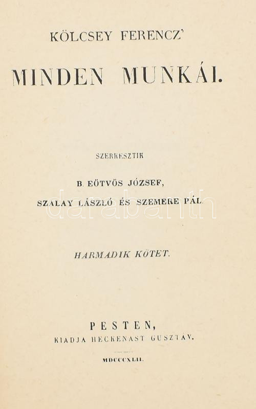 Kölcsey Ferenc minden munkái III. kötet: Aesthetikai és kritikai dolgozatok. Szerk.: B. Eötvös József, Szalay László és Szemere Pál. Pest, 1842, Heckenast Gusztáv, 6+254+1 p. Kolligátum: 3-4. kötet. Korabeli aranyozott egészvászon kötésben