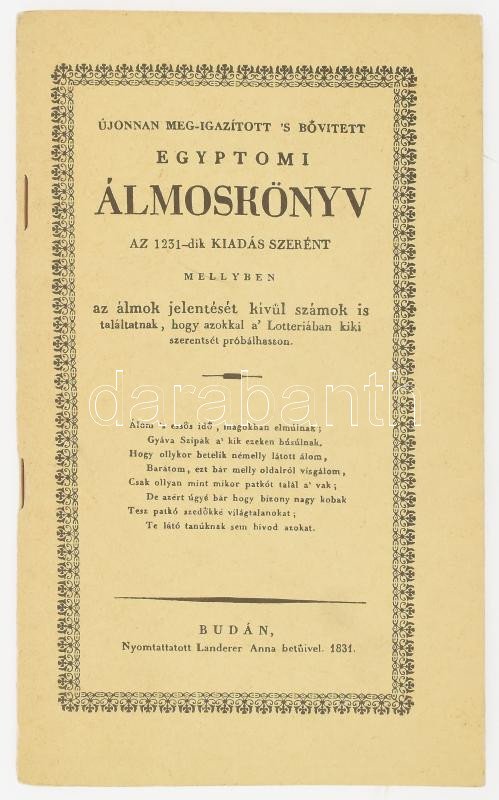 Leírás: Legujabb egyiptomi álmos könyv. [Bp.], én., Képzőművészeti Kiadó. Reprint kiadás! Kiadói papírkötés.