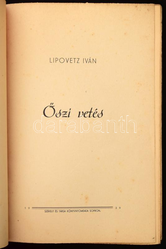 Lipovetz Iván: Őszi vetés. Sopron, 1939., Székely és Társa, 93+3 p. Ki... https://www.darabanth.com/hu/477-Gyorsarveres/477.0/Konyvek/Konyvek-Egyeb-ritkasagok~2000020/Lipovetz-Ivan-Oszi-vetes-Sopron-1939-Szekely-es-Tarsa-93plus3-p-Kiadoi-papirkotes-sza~II3253529