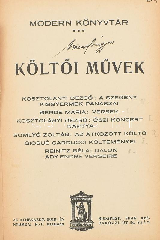 Modern könyvtár: Költői művek: Kosztolányi Dezső: A szegény kisgyermek panaszai, Berde Mária, Somlyó Zoltán, Giosué Carducci, Reinitz Béla versei. (közöttük első megjelenésekkel) Bp., é.n. Athenaeum Kiadói, kissé kopott félvászon kötésben