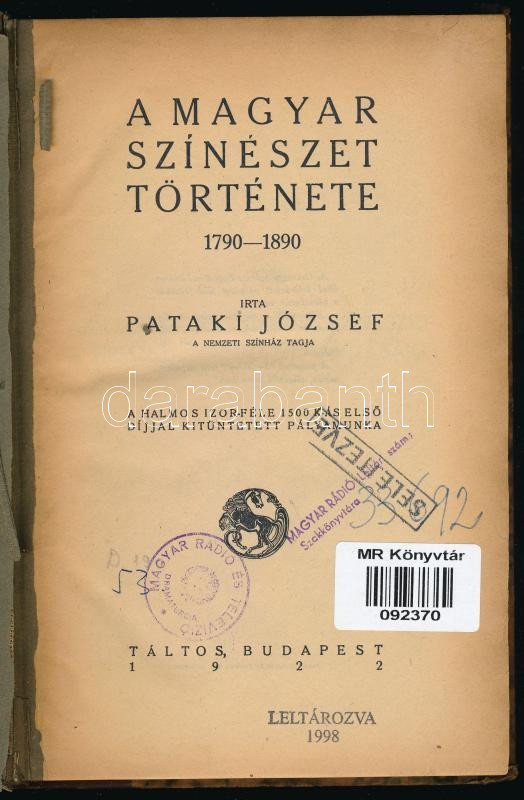 Pataki József: A magyar színészet története 1790-1890. Bp.,1922, Táltos, 222+2 p. Első kiadás. Átkötött félvászon-kötés, kijáró szennylappal, volt könyvtári példány.