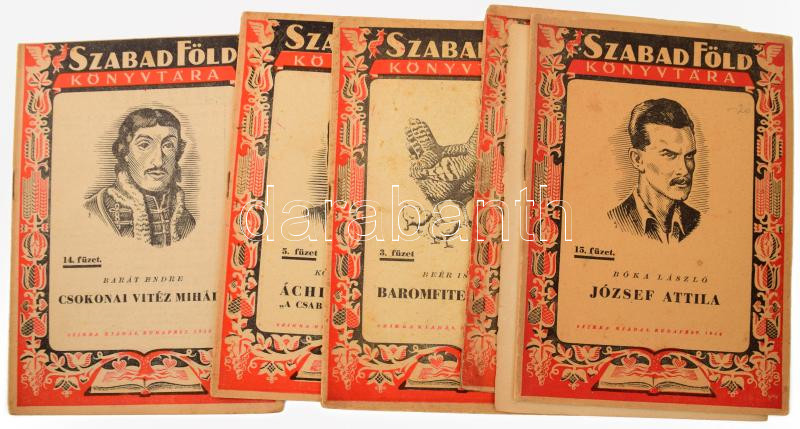 Szabad Föld Könyvtára 5 kötete (1., 3., 5., 14.,15.) Hegedűs Géza: Szent István, az országépítő; Beér István: Baromfitenyésztés, Koroda Miklós: Áchim András "a csabai parasztvezér", Barát Endre: Csokonai Vitéz Mihály, Bóka László: József Attila. Bp.,1946, Szikra. Papírkötések, közte szakadt borítókkal is.