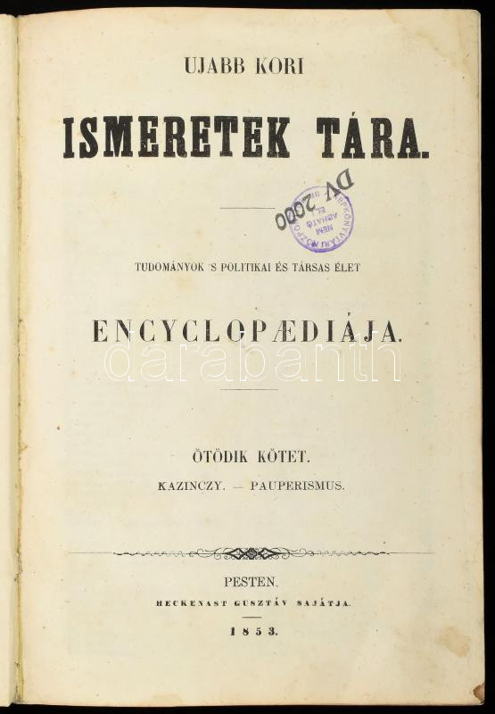 Ujabb kori ismeretek tára. Tudományok és politikai társas élet encyclopaediája. V. kötet. Pesten, 1853, Heckenast Gusztáv, VIII+664 p. Félvászon-kötésben, kopott borítóval, foltos lapokkal, régi intézményi bélyegzéssel.