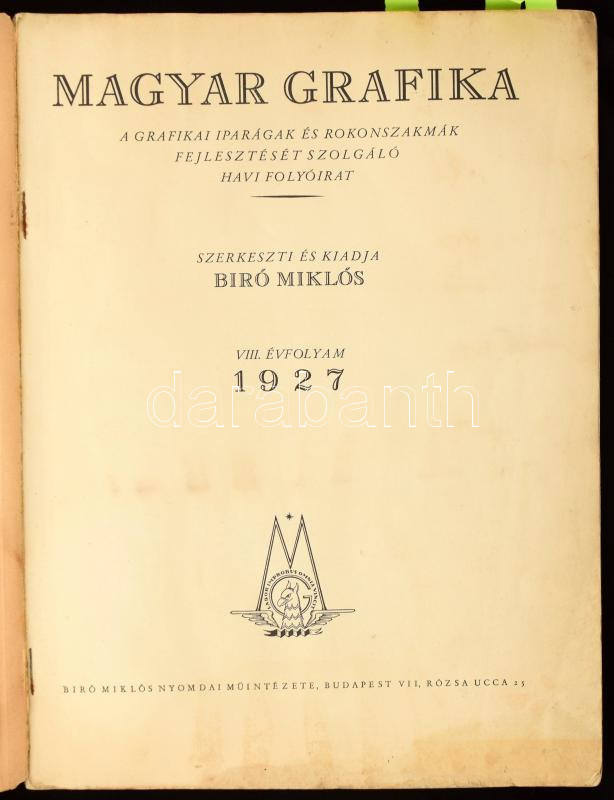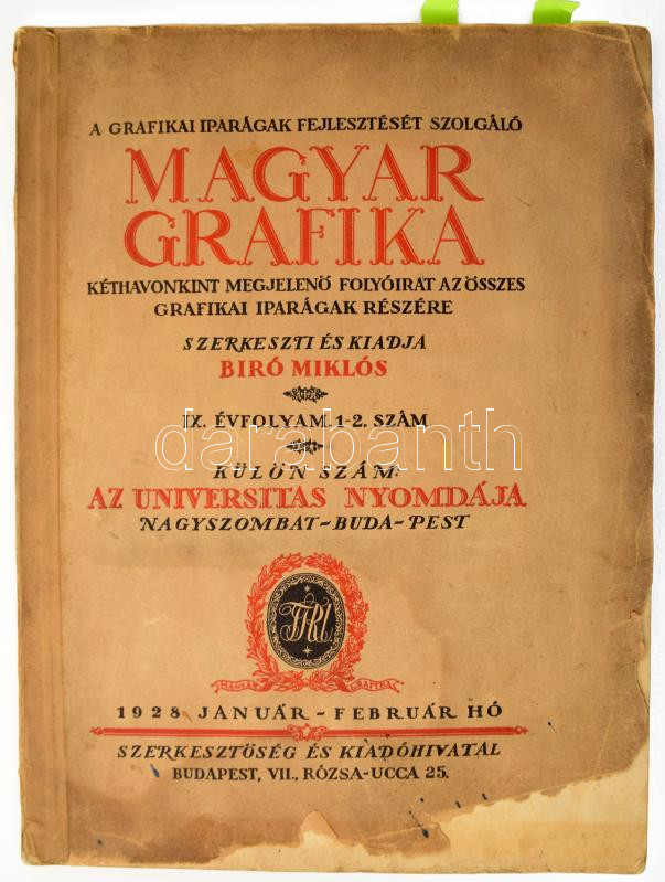 1928 Magyar Grafika IX. évf. 1-2. sz., 1928 jan.-feb. Külön szám: Az univeristas nyomdája. Nagyszombat - Buda-Pest. Szerk.: Biró Miklós. Bp., Bíró Miklós-ny., 72+IV p. Nagyon gazdag kép- és reklámanyaggal illusztrált. Kiadói papírkötés, sérült, hiányos borítóval, ázott, hullámos lapokkal, a címlapon tévesen 1927 szerepel.