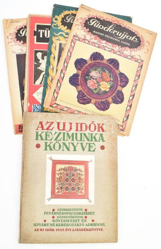 Az Új Idők kézimunka könyve: csomózott-, vert- és rececsipkék. Szerk. és rajzolta: Feyérné Kovács Erzsébet. Közreműködtek: Kövessi Edit és Ujváryné Kerékgyártó Adrienne. A szerkesztő, Feyérné Kovács Erzsébet által DEDIKÁLT példány. Bp., 1935., Singer és Wolfner, 72 p.+XXXII t. Kiadói egészvászon-kötés, foltos borítóval, az elülső borító felső sarkán hiánnyal. +1926-1927 Tündérujjak 5 száma, változó, többnyire sérült állapotban.