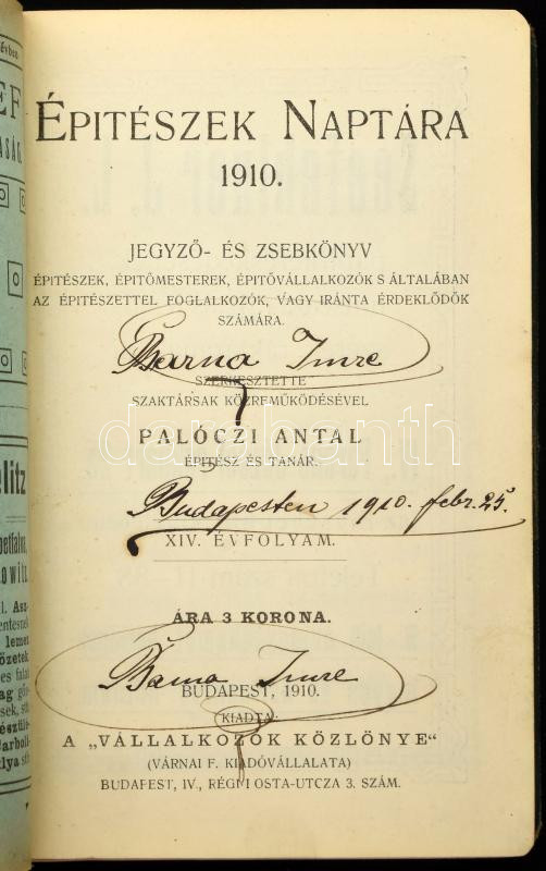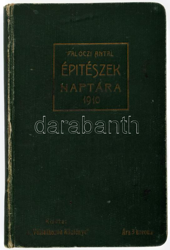 Építészek Naptára 1910. Jegyző- és zsebkönyv építészek, építőmesterek, építővállalkozók s általában az építészettel foglalkozók, vagy iránta érdeklődők számára. Szerk.: Palóczi Antal. XIV. évf. Bp., 1910, ,,Vállalkozók Közlönye". Kiadói egészvászon-kötés, Dárday Aladár-kötés, kopottas borítóval, korabeli tulajdonosi névbejegyzéssel.