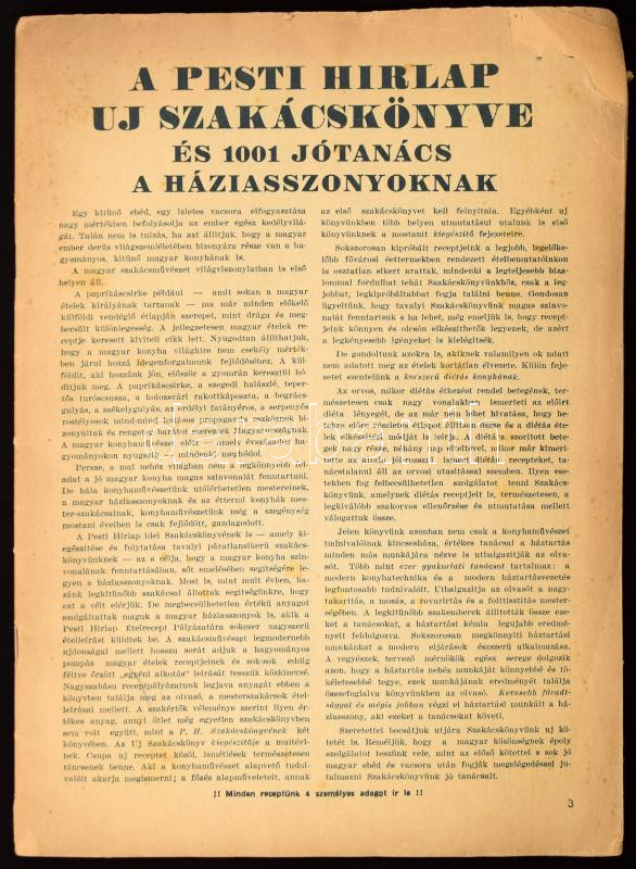 A Pesti Hírlap új szakácskönyve és 1001 jótanács a háziasszonyoknak. Bp, 1933, Légrády, 3-114 p. Papírkötés, borító nélkül, szamárfülekkel, lapszéli sérülésekkel.