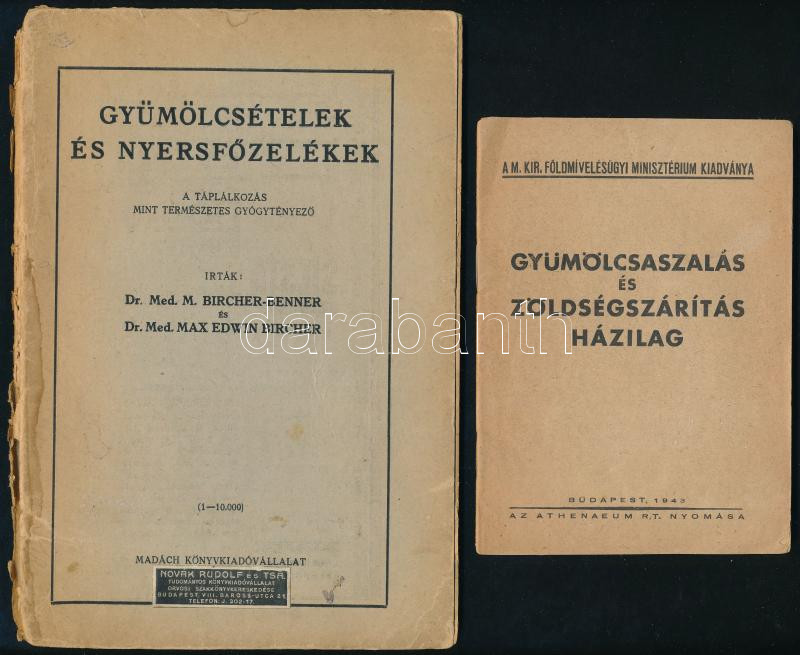 Gyümölcsaszalás és zöldségszárítás házilag. Bp., 1943, Athenaeum, 27 p. Kiadói papírkötés, kis lapszéli sérülésekkel (felvágták a lapokat.) + M. Bircher-Benner - Max Edwin Bircher: Gyümölcsételek és nyersfőzelékek. A táplálkozás mint természetes gyógtényező. Bp., én.,Madách (rajta Novák Rudolf címke.) Kiadói papírkötés, sérült borítóval, a könyvtest elvált a borítótól.