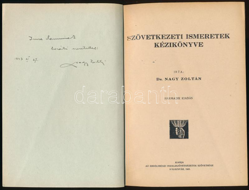 Dr. Nagy Zoltán: Szövetkezeti ismeretek kézikönyve. DEDIKÁLT! Kolozsvár, 1943, Erdélyi Iskolaszövetkezetek Szövetsége. Kiadói papírkötés, jó állapotban.