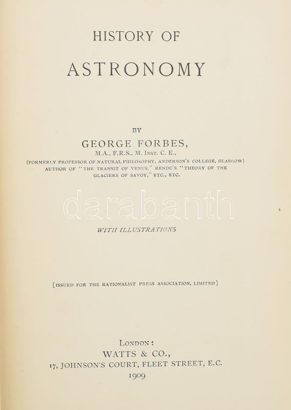 Forbes, George: History Of Astronomy. London, 1909, Watts & Co. Angol nyelven. Fekete-fehér képekkel illusztrált. Kiadói egészvászon-kötés, kissé sérült gerinccel, kopott borítóval, első néhány lap szélén ázásnyommal.