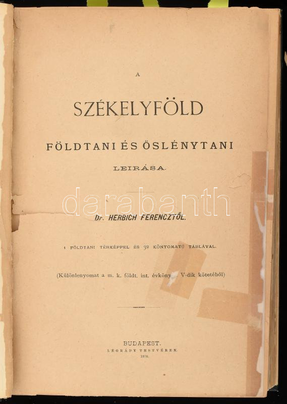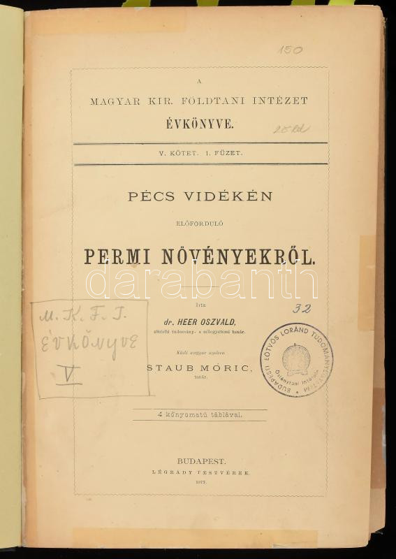 Heer Oszvald: Pécs vidékén előforduló Permi növényekről. Közli magyar nyelven Staub Móric. Magyar Királyi Földtani Intézet évkönyve V. köt. 1. füzet. Bp., 1877, Légrády, 16 p.+4 (kőnyomatú táblák) t. Hozzákötve: Herbich Ferenc: A Székelyföld földtani és őslénytani leírása. [Magyar Királyi Földtani Intézet évkönyve V. köt. 1. füzet.] Bp.,1878,Légrády, 2+302+2+VI+2 p. + 26 (a táblák magyarázó lapjai) sztl. lev. + I-XIX, XX/A-M (litográfiák, 4 kihajtható, kettős táblával (VI-VII, XII-XIII, XIV-XV, XVI-XVII) t. + 1 (Székelyföld földtani térképe, színes litografált kihajtható térkép, sérült, 75x61 cm) t. Átkötött modern műbőr-kötés, régi intézményi bélyegzéssel, 8 lap javított, az 1. részben az 3 lap és 2 tábla kijár, egy lap a gerinc mentén szakadt, a 2. részben a XX. tábla hiányzik, a térkép sérült, szakadt.