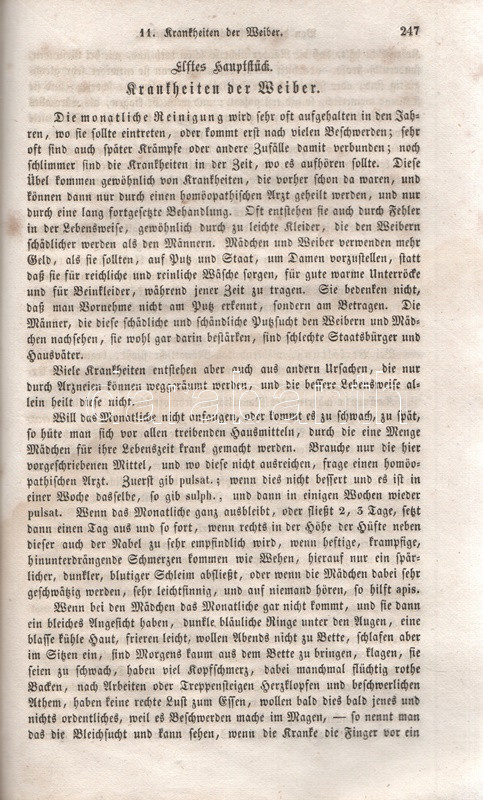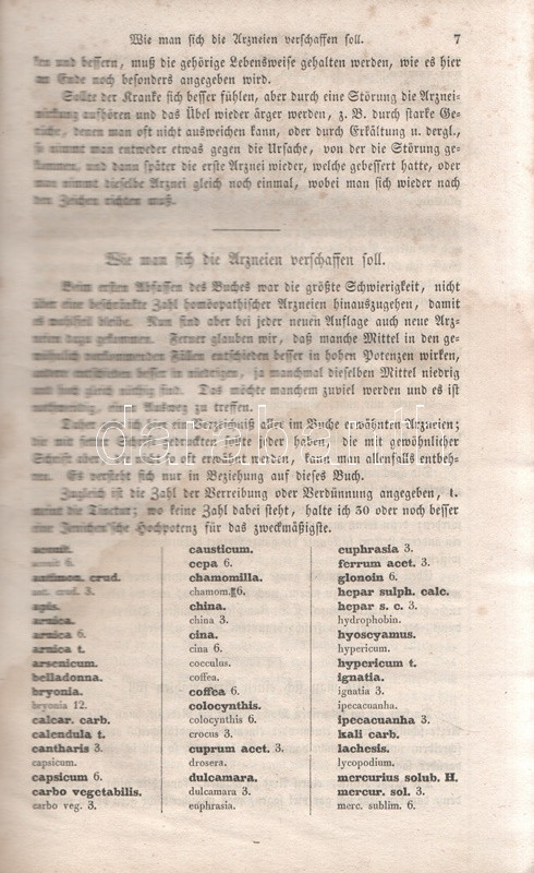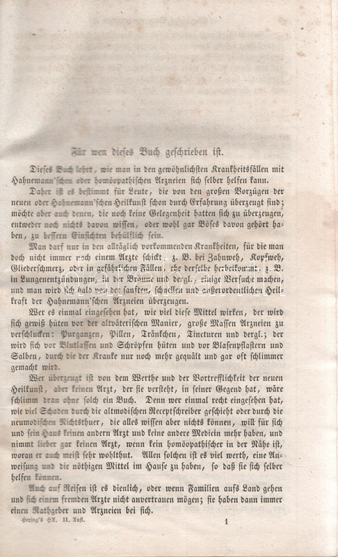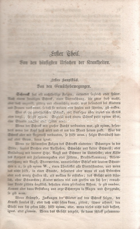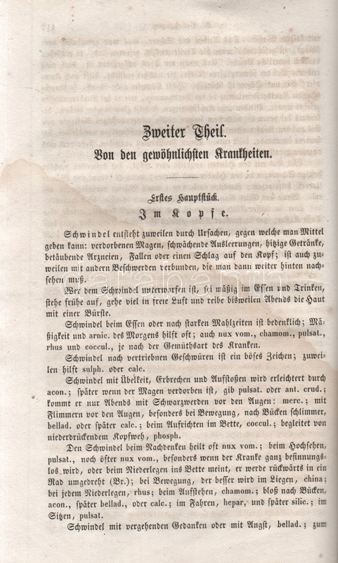 Hering, Constantin: Constantin Hering's Homöopatischer Hausartzt. Nach den besten homöopatischen Werken und eigenem Erfahrungen bearbeitet. Jena, 1860. Druck und Verlag von Friedrich Frommann. X + 325 + [1] p. Constatin Hering (1880-1880) német származású amerikai orvos és természetgyógyász, a hasonszenvi gyógymód első nagy amerikai képviselője. A lipcsei és würzburgi egyetemeken végzett tanulmányai után a szász uralkodó megbízásából egy latin-amerikai expedíció munkatársa volt. A német orvos 1833-tól az Egyesült Államok keleti partján, Philadelphiában telepedett le, több amerikai egyetemen is tanított, valamint természetgyógyászi praxist is vezetett. A természetgyógyászat terén első munkáját még 1828-ban adta ki, ,,Homöopathischer Hausarzt" címmel, ennek javított kiadásai ,,Constantin Hering's Homoeopatischer Hausartzt" címmel 1840 után számos alkalommal megjelentek. Példányunk a 11. kiadásból való. A szerző a testi bajokra gyógynövény-használatot, illetve életmód-változtatást javasol. A munka második részében az érzékszervek betegségeire, illetve belgyógyászati problémákra javasol gyógynövényes kúrát, a nőgyógyászat és a gyermekgyógyászat témáira is kitérve. A kötet végén részletes tárgymutató. Gót betűs szövegoldalakkal. Az első előzéken és a címoldalon régi tulajdonosi szárazbélyegzés. Számos oldalon enyhe foxing, illetve halvány foltosság, két levél sarkán apró, a szövegtükröt nem érintő hiány. Poss.: Josef Steinbach pesti gyarmatáru-kereskedő. Aranyozott gerincű, vaknyomásos korabeli egészvászon kötésben. Jó példány.
