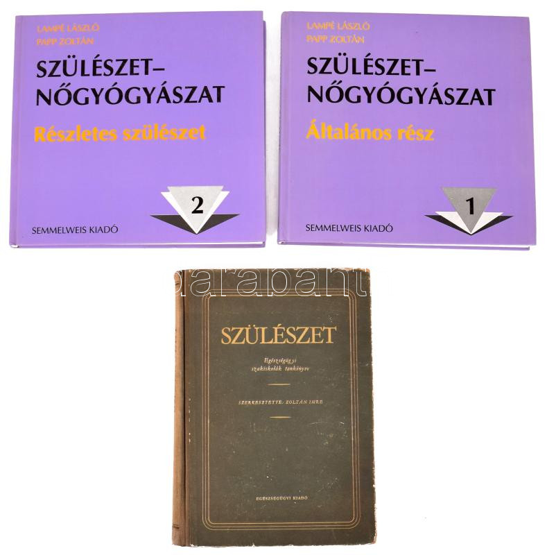 Leírás: Lampé László - Papp Zoltán: Szülészet-nőgyógyászat. 1-2. köt. Bp., 1992, Semmelweis Kiadó. Kiadói kartonált papírkötés. + Zoltán Imre (szerk.): Szülészet. Bp., 1953., Egészségügyi. Kiadói félvászon-kötés, kopott borítóval.