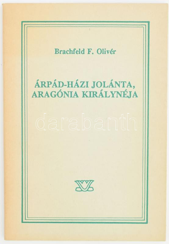 Leírás: Brachfeld F. Olivér: Árpád-házi Jolánta, Aragónia királynéja. Ford.: Csikós Margit. Szeged, 1994, magánkiadás. Második, javított kiadás. Kiadói papírkötés, kiadói papír védőborítóban, jó állapotban.