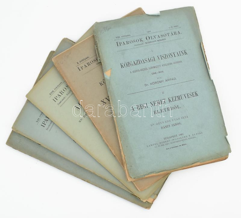 Iparosok Olvasótára 5 db száma: Körömy Árpád: Közgazdasági viszonyaink a vegyes-házból. származott királyaink korában. 1301-1626. Bánfi János: A régi német kézművesek életéből. VIII. évf. 7-8. sz.; Körömy Árpád: Közállapotaink a XVI. században. X. évf. 1-2. sz.; Hajnóczy Iván: A céhek életéből. XV. és XVI. századbeli céhszabályok. XVII. évf. 10. sz.; Csízik Gyula: A biedermeier és az újabb stílusfejlődés. XXI. évf. 4-5. sz.; Kerekes György: Polgárosztályunk kifejlődésének nehézségei a XVII. században. Kassa előkszítése a Rákóczi-fölkelésre (1688-1700). XXII. évf. 8. sz. Bp., 1902-1916, Lampel R. (Wodianer F. és Fiai). Kiadói papírkötés, változó állapotban.