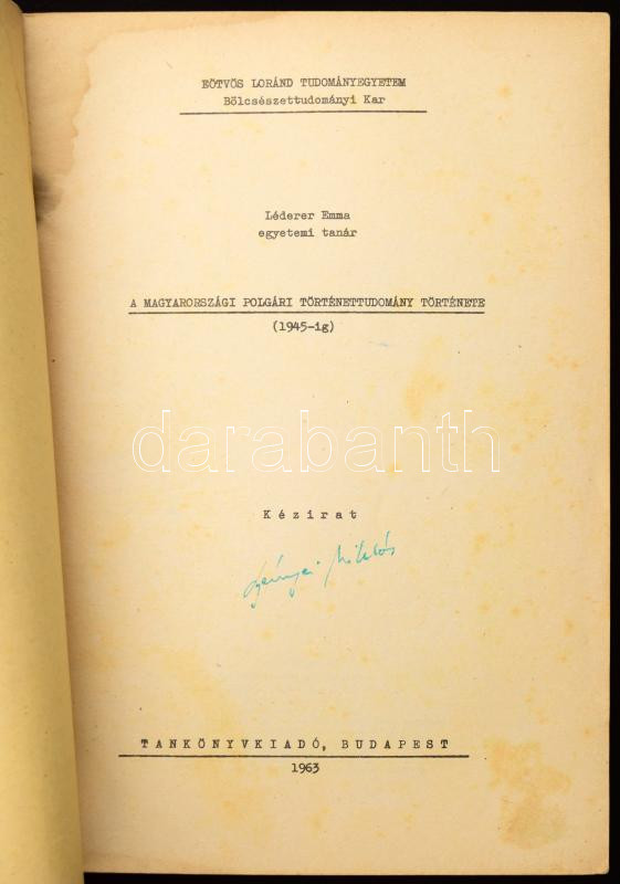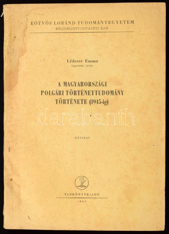 Léderer Emma: A magyarországi polgári történettudomány története (1945-ig.) Kézirat. ELTE BTK. Bp., 1963, Tankönyvkiadó. Kiadói papírkötés, foltos. Megjelent 690 példányban.