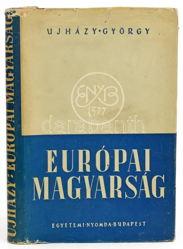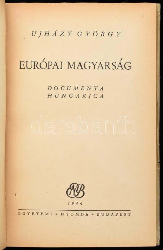 Ujházy György: Európai magyarság. Documenta Hungarica. Bp., 1946, Egyetemi Nyomda. Kiadói félvászon-kötés, kiadói javított és kissé sérült papírborítóval.
