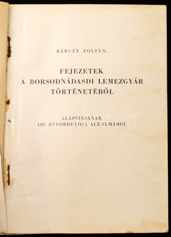 Leírás: Bárczy Zoltán: Fejezetek a Borsodnádasdi Lemezgyár történetéből. Alapításának 100. évfordulója alkalmából. Borsodnádasd, 1960. Kiadói papírkötés, sérült papír védőborítóval, kopottas állapotban.