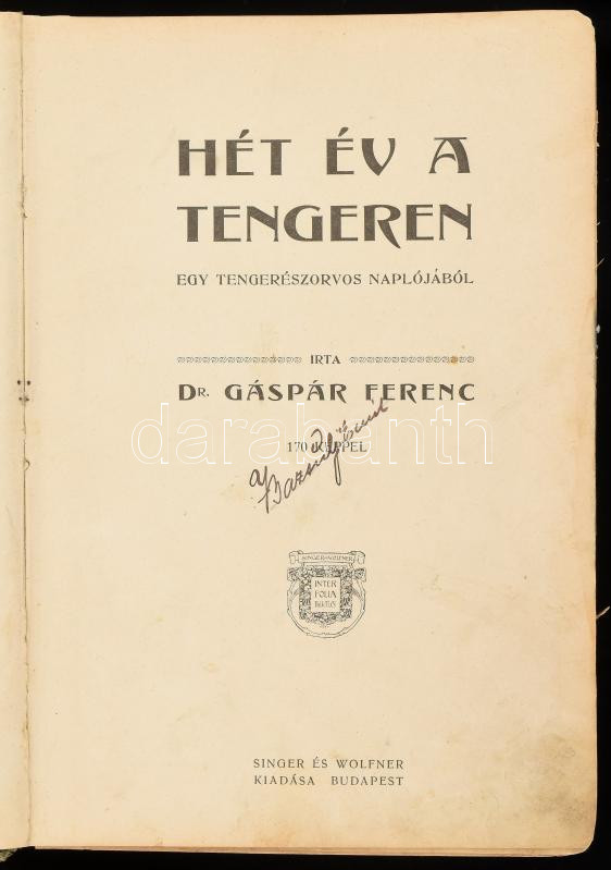 Dr. Gáspár Ferenc: Hét év a tengeren. Egy tengerészorvos naplójából. Bp., [1903], Singer és Wolfner, VIII+527+(1) p. Szövegközti és egészoldalas, fekete-fehér képekkel illusztrálva. Átkötött félvászon-kötésben, sérült, rossz állapotban, több lap kijár.