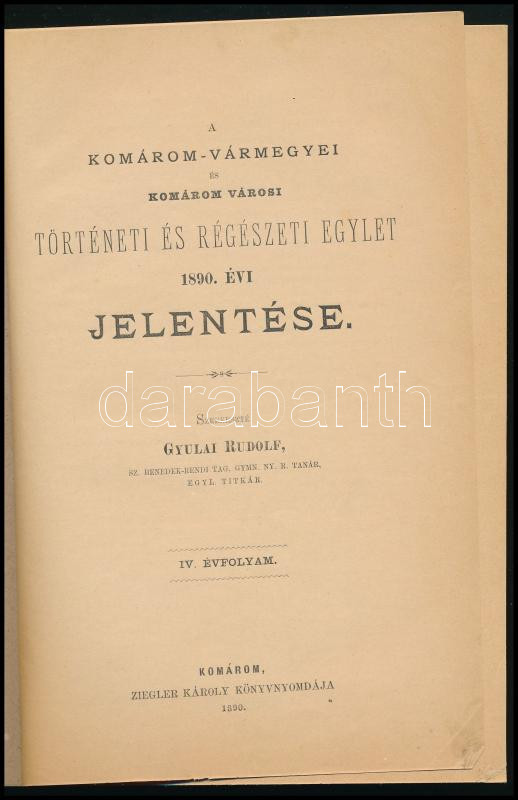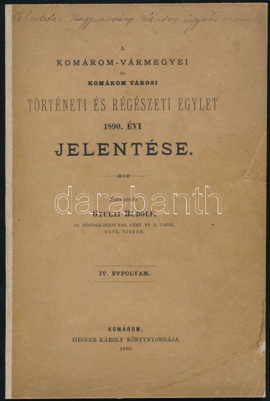 Gyulai Rudolf (szerk.): A Komárom-Vármegyei és Komárom Városi Történeti és Régészeti Egylet 1890. évi jelentése. IV. évfolyam. Komárom, 1890, Ziegler Károly-ny., 108+(4) p. Átkötött papírkötésben, az eredeti papírborító felhasználásával, nagyrészt jó állapotban. A borítón Nagyvasváry Sándor ügyvéd részére szóló sorokkal (dedikáció?).
