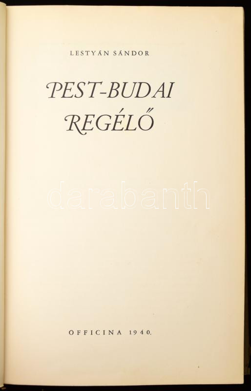 Lestyán Sándor: Pest-Budai regélő. Bp., 1940, Officina, 1 t.+245+1 p.+ 5 (egy kihajtható táblával) t. Kiadói fél-pergamenpapír-kötésben, a kötéstáblán a budai várat ábrázoló fém plakettel, sérült gerinccel.