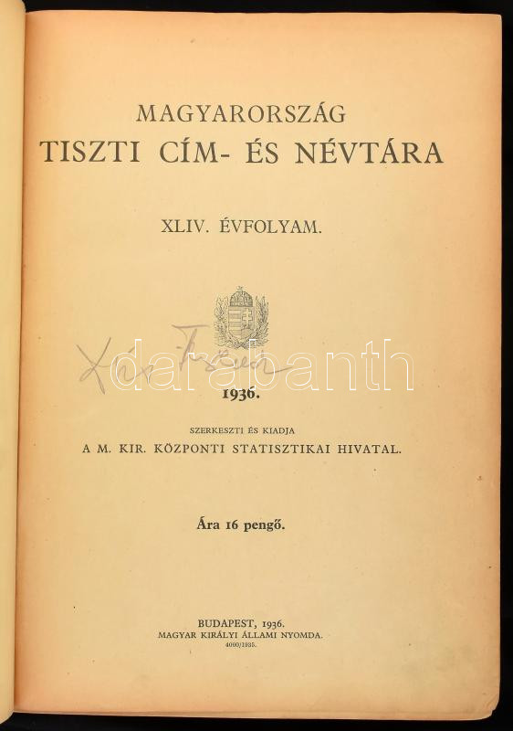 Magyarország tiszti cím- és névtára. 1936. XLIV. évfolyam. Szerk. és kiadja a M. Kir. Központi Statisztikai Hivatal. Bp., 1936., M. Kir. Állami Nyomda, XVI+664+26 p. Kiadói egészvászon-kötés, kopott borítóval, sérült gerinccel, egy kijáró lappal, laza fűzéssel.