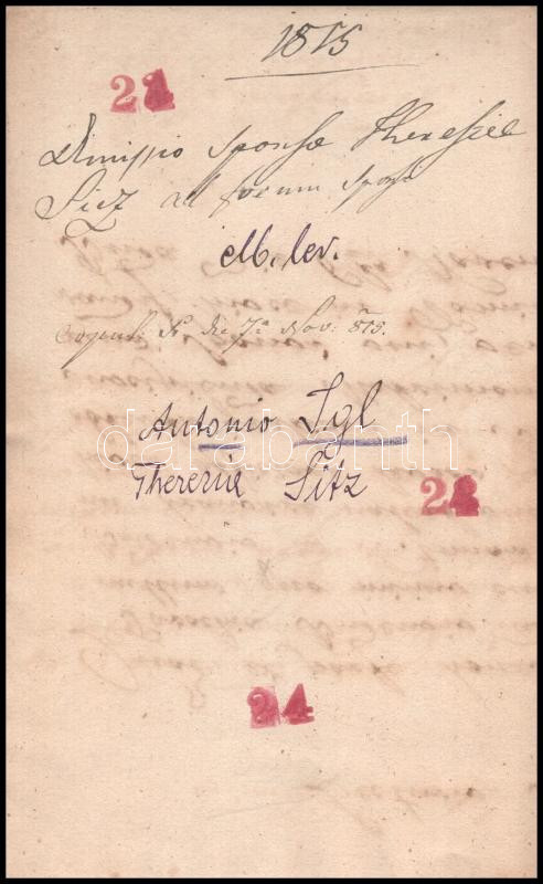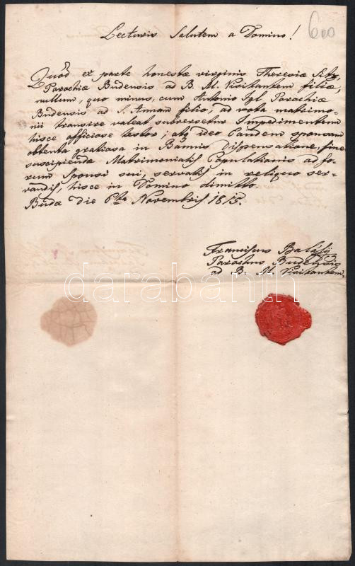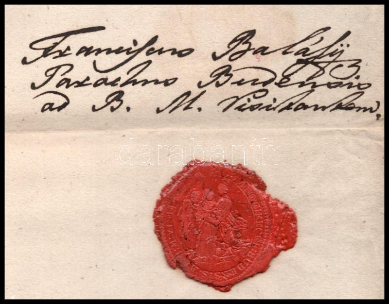 Leírás: 1815 Balásy Ferenc Xavér Ágost (1748- 1828) jezsuita szerzetes, budai főjegyző aláírásával ellátott viaszpecsétes okirat